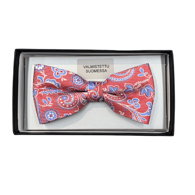 Punasinisävyinen rusetti miehille Matexilta. Miesten paisley-kuosillinen juhlarusetti monenlaisiin, iloisiin juhliin.